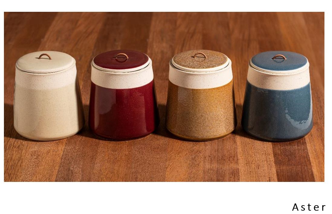 With their unique design, our Aster canisters fit right in any home. Each canister is finished with a reactive dipped glaze and a features exposed speckled clay around the bottom, with a leather hand pull on the lid. These versatile pieces can be used around the kitchen, home office or bathroom.