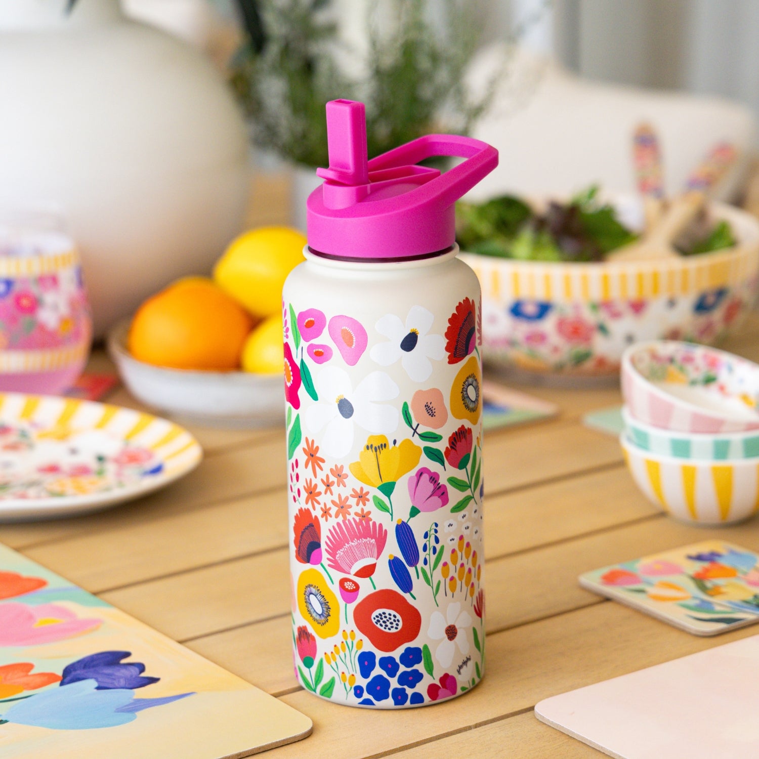 - Product Details: Double-walled insulated drink bottle with printed design.