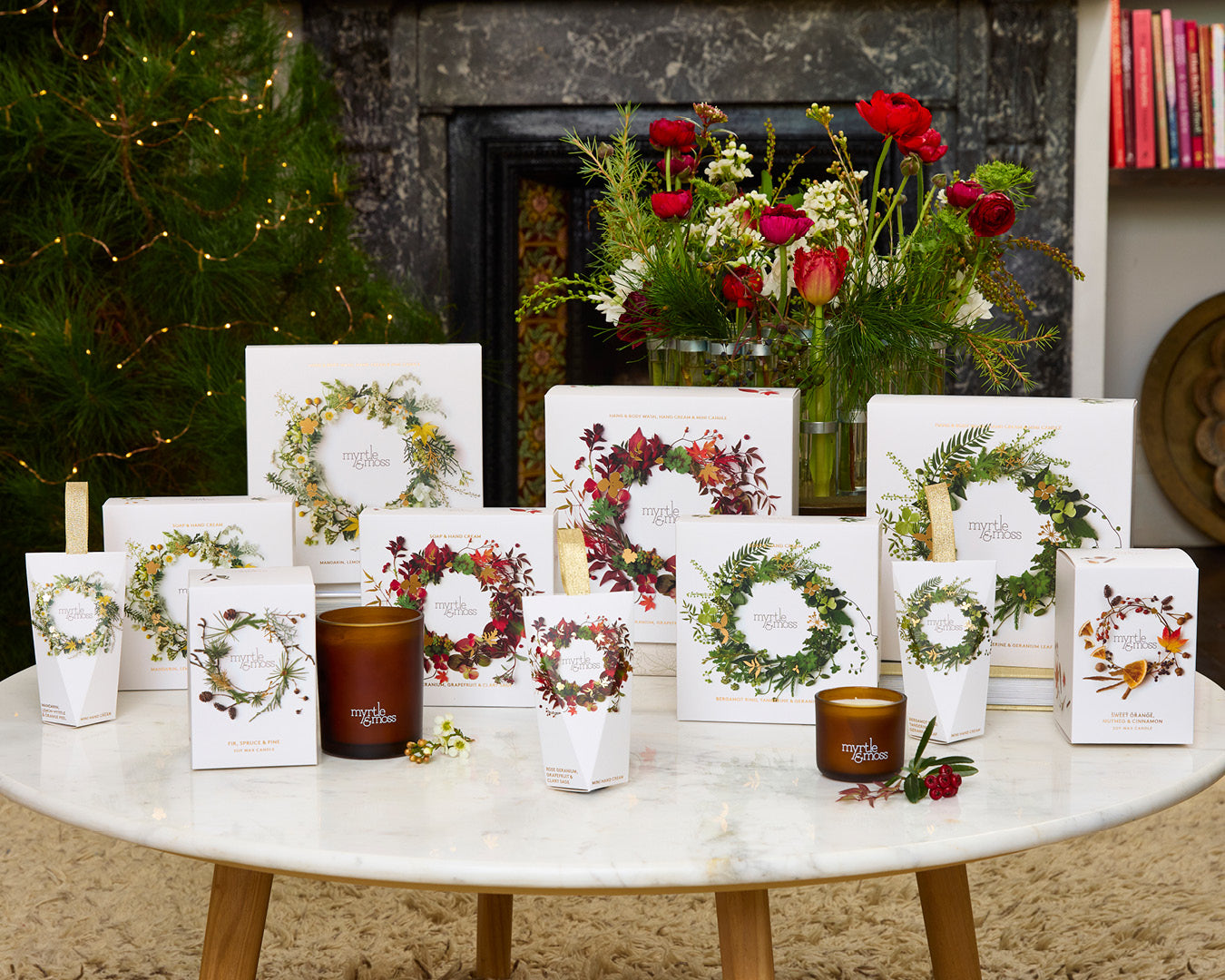 Drawing inspiration from nature Myrtle & Moss proudly introduces a stunning collection of botanical Christmas wreaths — one for each of our signature scents.
