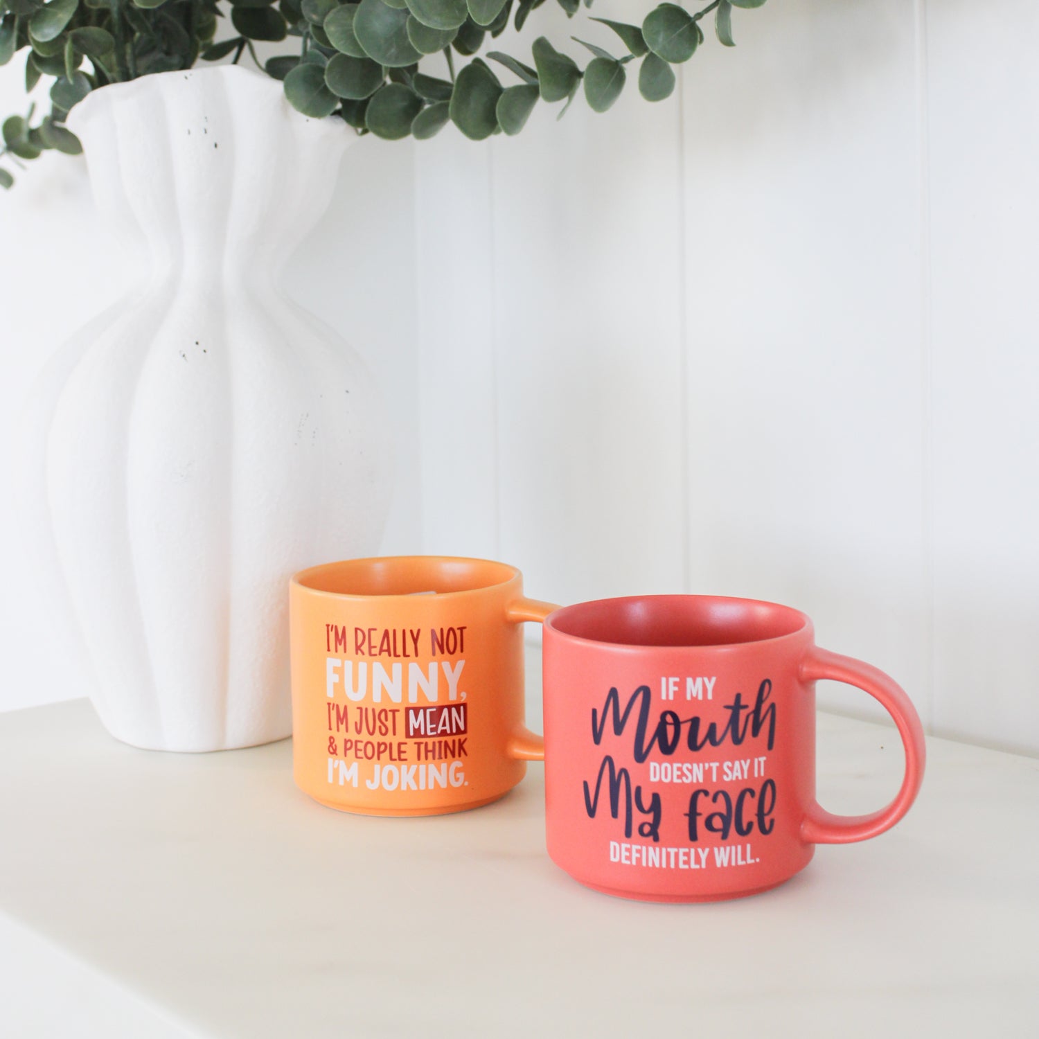 Perfect for brightening up your morning coffee or as a lighthearted gift, these mugs are designed to stand out with their eye-catching colours and cheeky phrases. Whether you're in need of a laugh or gifting some good vibes,