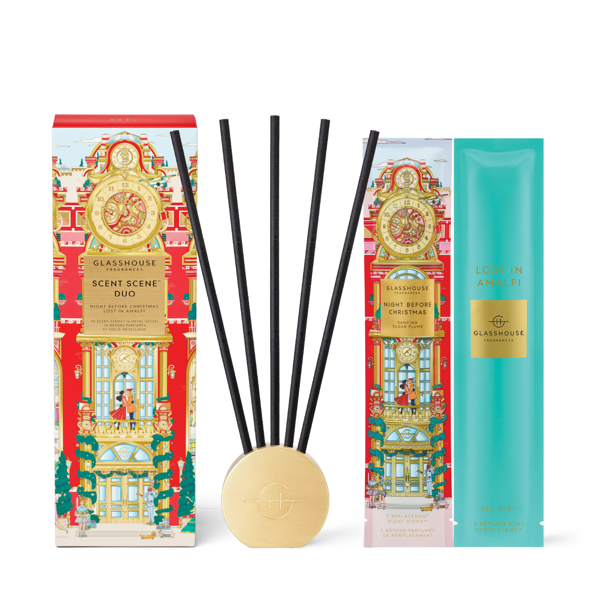 The Scent Scene™ Duo includes two individually packaged Scent Stems™ fragrances: Night Before Christmas Dancing Sugar Plums (limited edition) and Lost In Amalfi To use place your Scent Stems™ of choice into the metal vessel, ensuring it's placed on a flat surface away from open windows or vents. After 30 days, or a time of your choosing, swap out the Scent Stems™ for the other supplied fragrance.