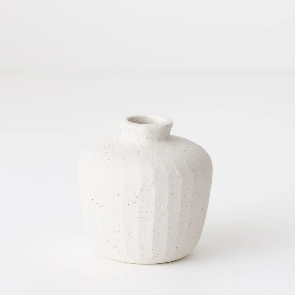 A refined collection of speckled white ceramic vessels, each featuring hand-finished linear details. The Coa range brings subtle texture and artisanal charm to any interior. Not guaranteed to hold water.