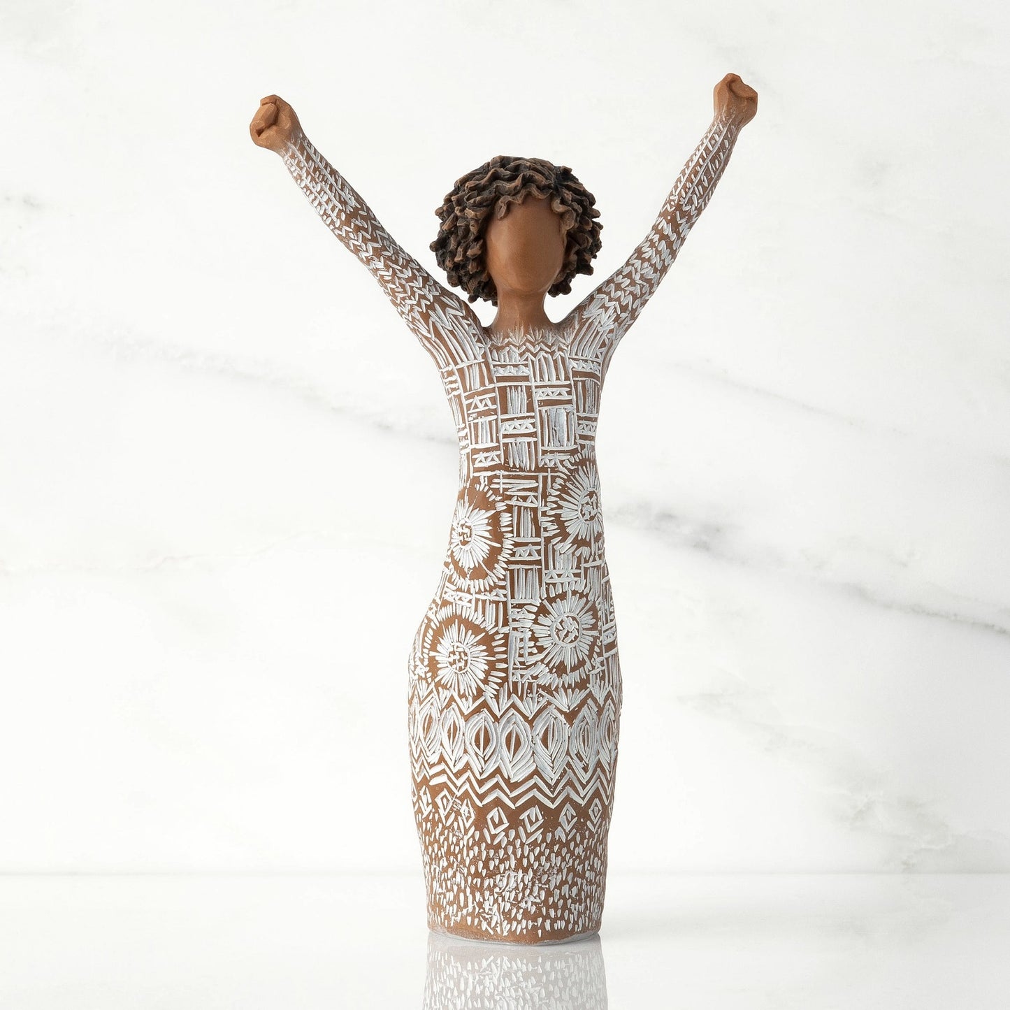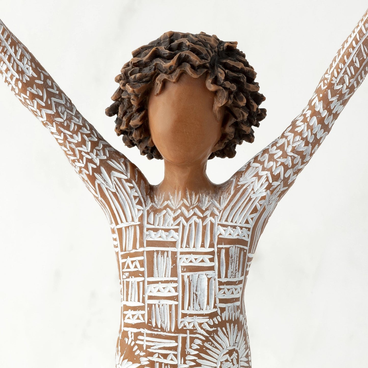 “With this figure, I’m celebrating pride in one’s heritage – how knowing the past gives confidence in the present, and a sense of who we are. Heritage can be expressed by customs or language, or as in this figure, textile patterning. The etchings that cover her are inspired by traditional African woven Kente cloth, mud cloth, and iconic Kuba cloth markings. African textiles have such vibrancy! And are tied to dance and rhythm and movement. “She’s expressing who she is and celebrating the color of her skin. Her skin shines through and contrasts with the lively patterns. Her exuberant stance is a physical representation of what I hope she feels within. This piece is the opposite of being invisible. She’s standing up and standing tall, centered in courageous joy. “As a healing piece, her gesture reflects the uplifting support of those who love and encourage her... who give her the strength to advocate for herself in the healing process. To face obstacles and aggressions with courageous joy, to be seen and be heard, is perhaps a shared healing made more powerful by connectiveness and community.” – Susan Lordi