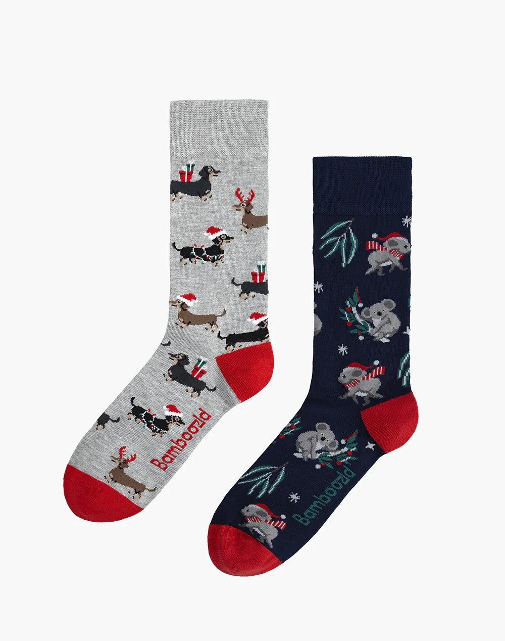This 2pk Gift Box is the perfect Christmas gift for someone special or a delightful treat for yourself. This festive gift box includes two pairs of crew socks featuring playful designs with Xmas Dachshunds and charming Gumleaf Koalas, all elegantly packaged in a matching gift box.