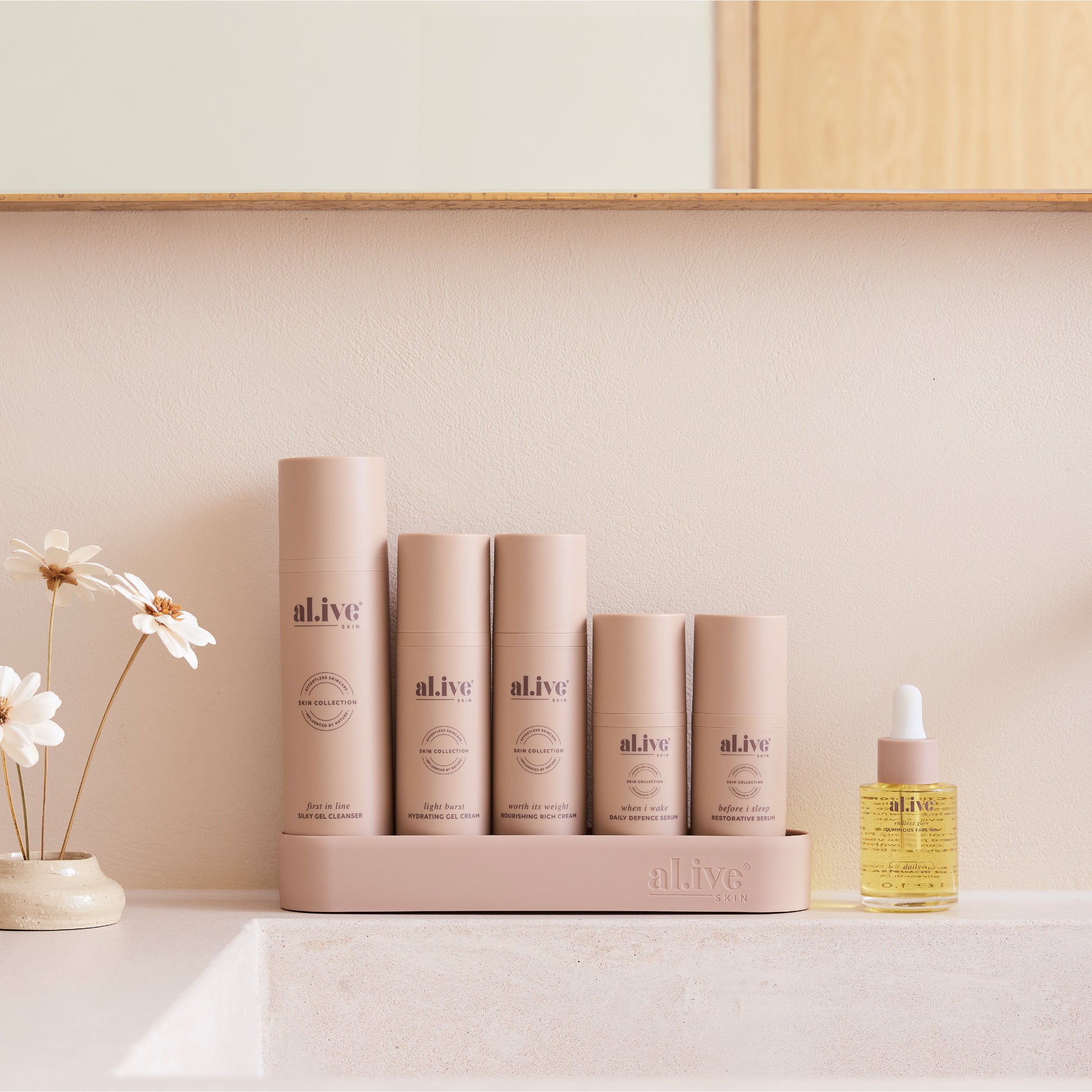 The five-piece tray is built for those who want their complete skincare lineup at the ready. Spacious, elegant, and design-led, it brings intention to your entire ritual by giving each product a dedicated place in your space. When your skincare is visible, accessible, and part of your environment, consistency follows, and with consistency comes results.