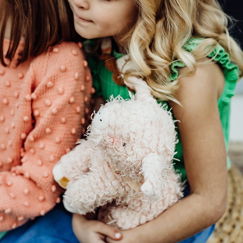 Hammie the Pig is quite possibly the most adorable pig ever to come from the farm. Scraggly fur in a lovely shade of pink with soft striped ears and hoofs. Hand embroidered eyes and kissably cute snout make this the stuffed pig blue ribbon worthy from even the most discerning of judges! Part of the Good Friends Farm collection.