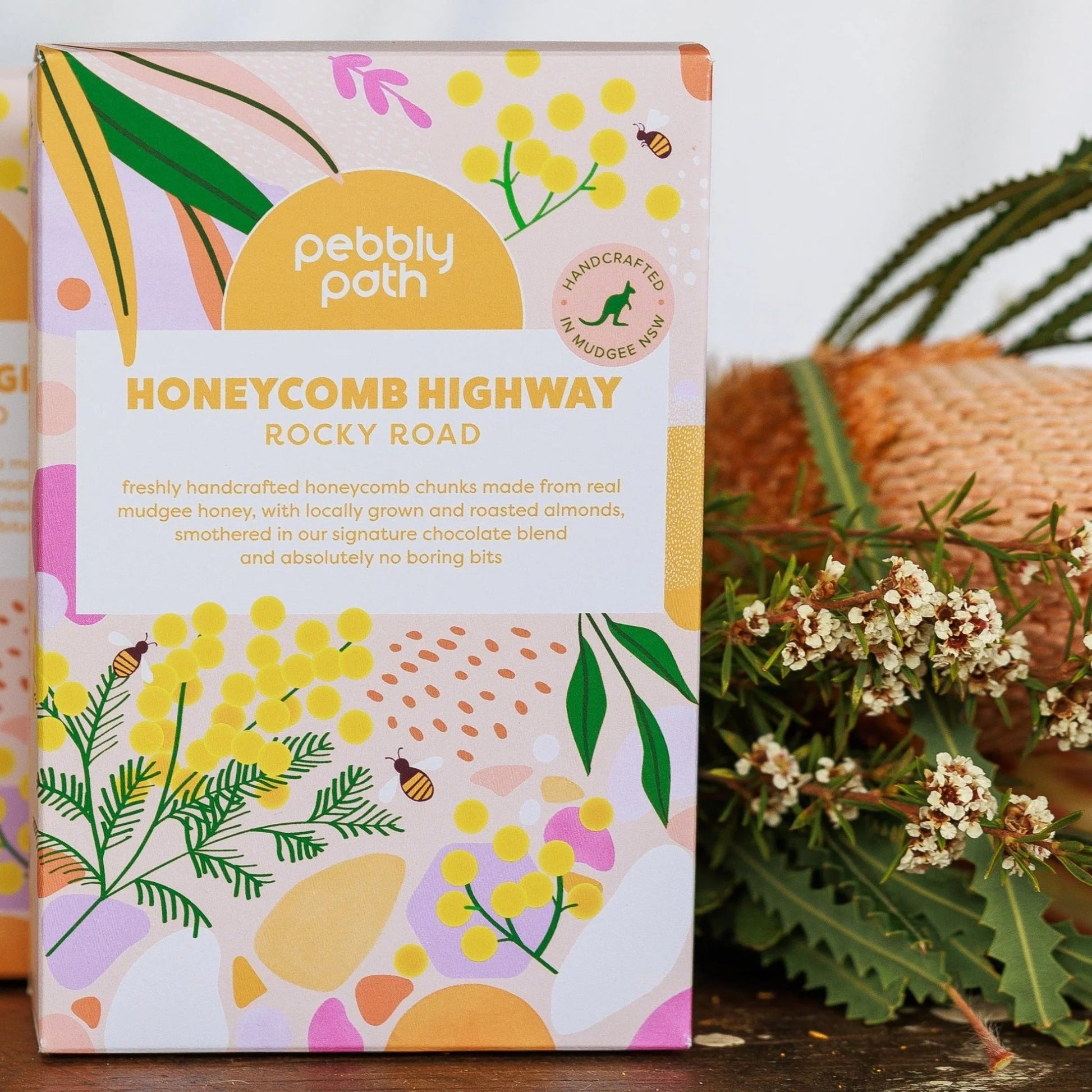 Combine this with whole roasted almonds from Outback Almonds on the Darling River, peanuts, and pillowy vanilla marshmallow, then all smothered in Pebbly Path's signature blend of premium couverture chocolate.