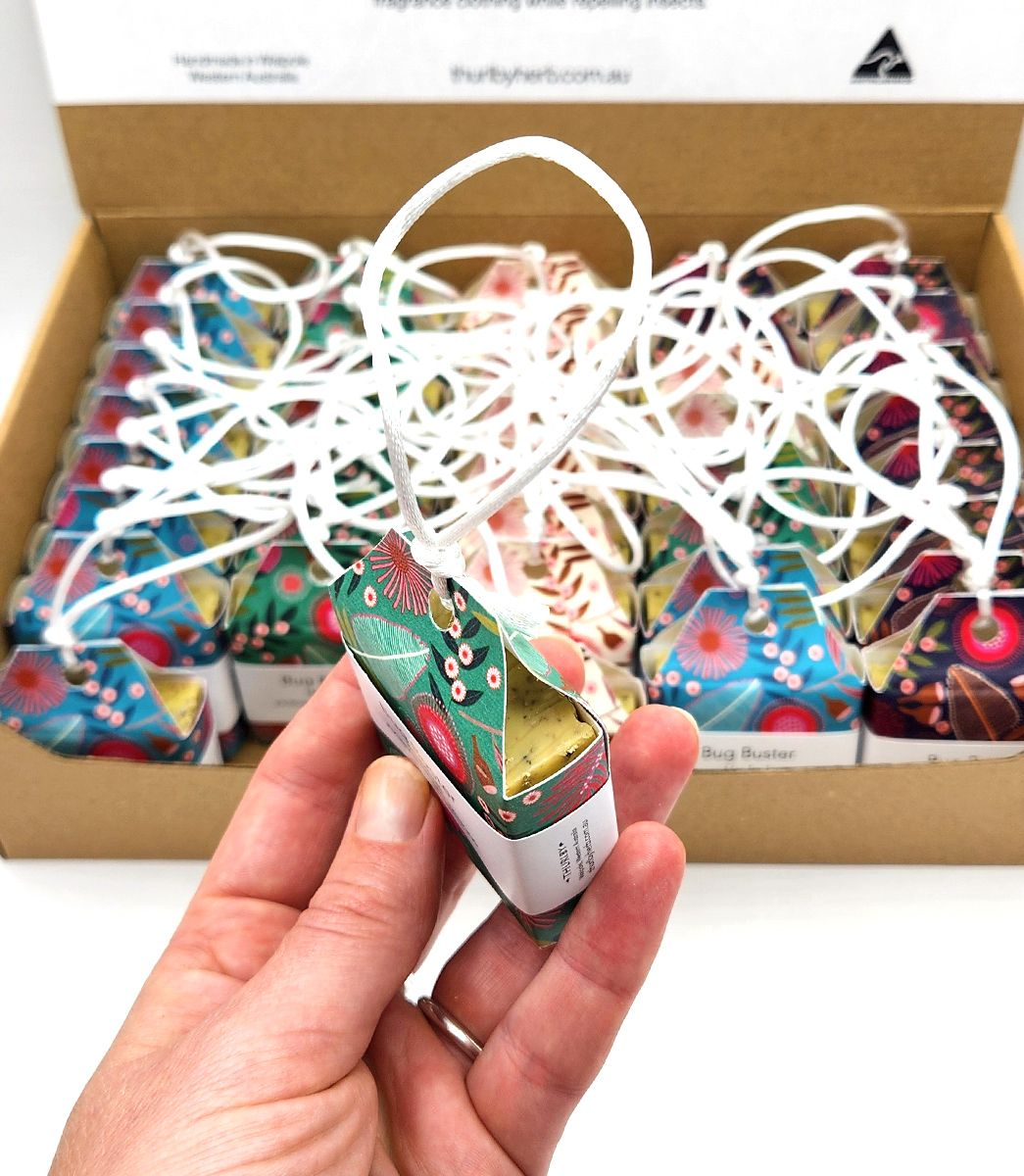 Naturally freshen and protect your wardrobe with a touch of Australian design. Made from natural vegetable, essential and fragrance oils, this Herbal Bug Buster helps deter insects while gently scenting your clothes.