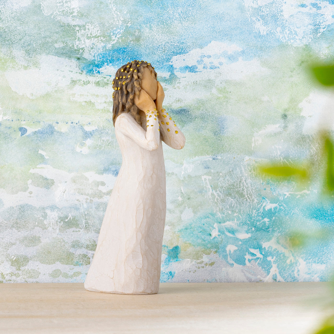 An angelic figure with a gesture of awe and wonder approaches the Christmas Nativity scene. Gold leaf in her hair suggests a halo, and gold adorns the sleeves of her dress. She can be added to the Nativity Collection as an additional angel, or be part of holiday décor with other figures of hope and wonder.