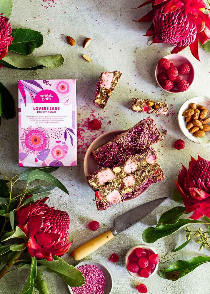 Lovers Lane is bursting with luscious raspberry lollies, fluffy raspberry marshmallow, toasted coconut, freshly roasted almonds from 'Outback Almonds' on the Darling River, peanut chunks and the added surprise of popping candy - this rocky road is as exciting as it is delicious.