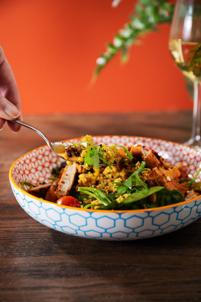 Vibrant stoneware bowls with a shallow design, this versatile bowl is perfect for serving pasta, stews, salads, stir-fries, and more. Add a touch of charm to your tablescape. Beautifully designed with eye-catching patterns, this bowl is perfect for everyday meals and special occasions. It is designed for convenience and is microwave and dishwasher-safe, making it easy to use and care for.