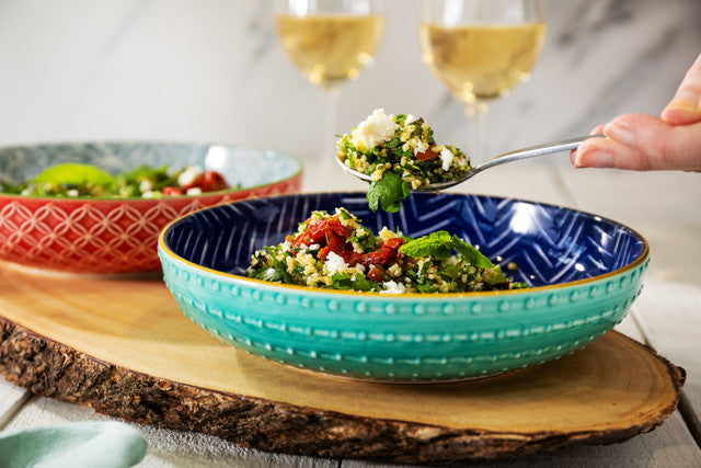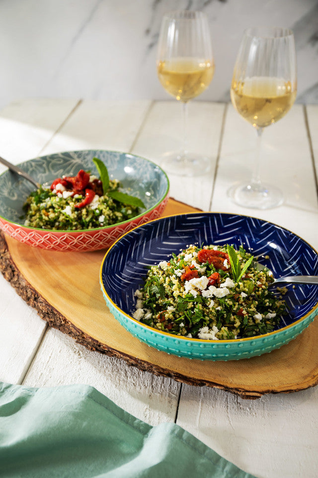 Vibrant stoneware bowls with a shallow design, this versatile bowl is perfect for serving pasta, stews, salads, stir-fries, and more. Add a touch of charm to your tablescape. Beautifully designed with eye-catching patterns, this bowl is perfect for everyday meals and special occasions. It is designed for convenience and is microwave and dishwasher-safe, making it easy to use and care for.
