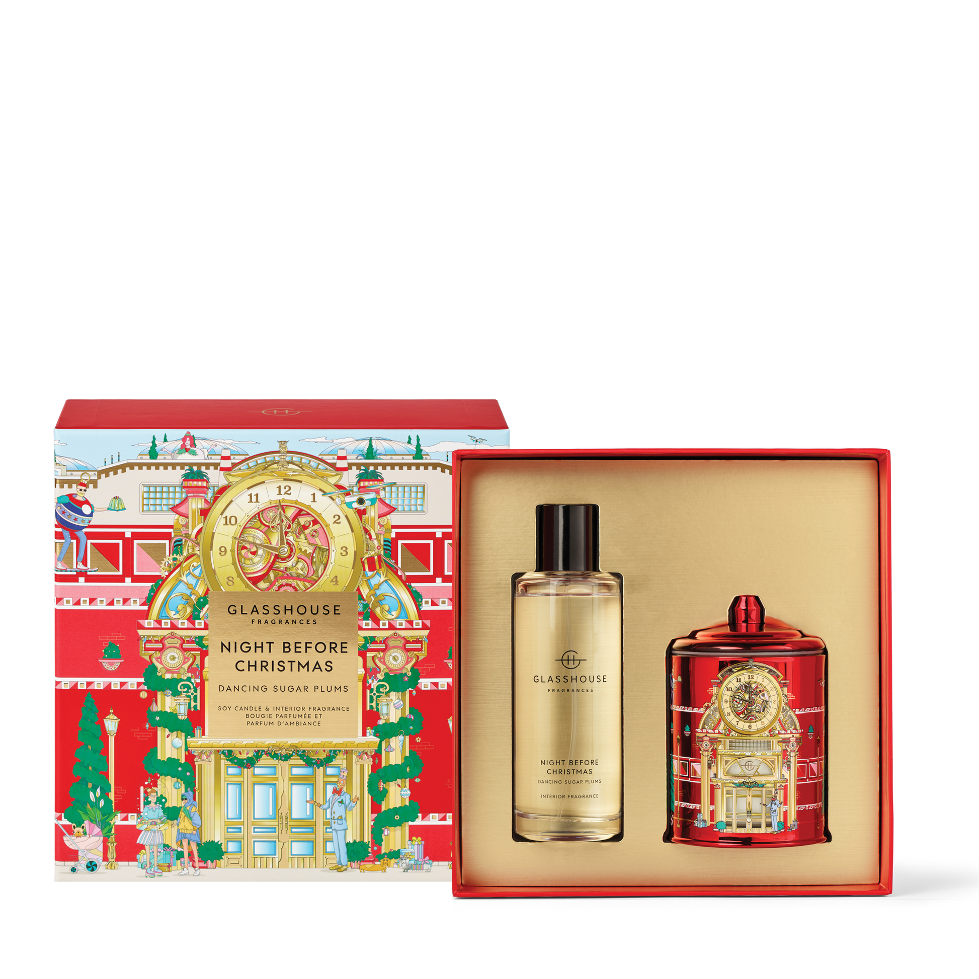 Contains 1 x 150mL Interior Fragrance & 1 x 200g Night Before Christmas Soy Candle, all wrapped up in a festive Gift Box with illustrations by Aeoniumsky.