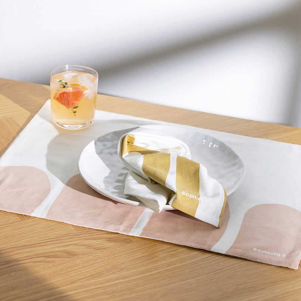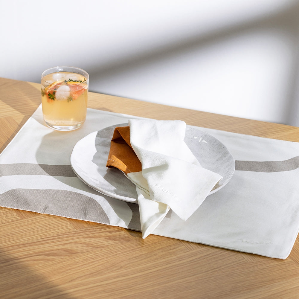 hen your wanderings lead you home, settle in with the extended Nomad collection, now available in napery to complete the look. The milky base colour of this range is the perfect background to showcase the sweeping abstract elements in hues of amber, blush, papaya and charcoal. Made of 100% cotton, the set of 4 napkins and placemats, as well as table cloth feature the well-loved Nomad designs to elevate any table setting.