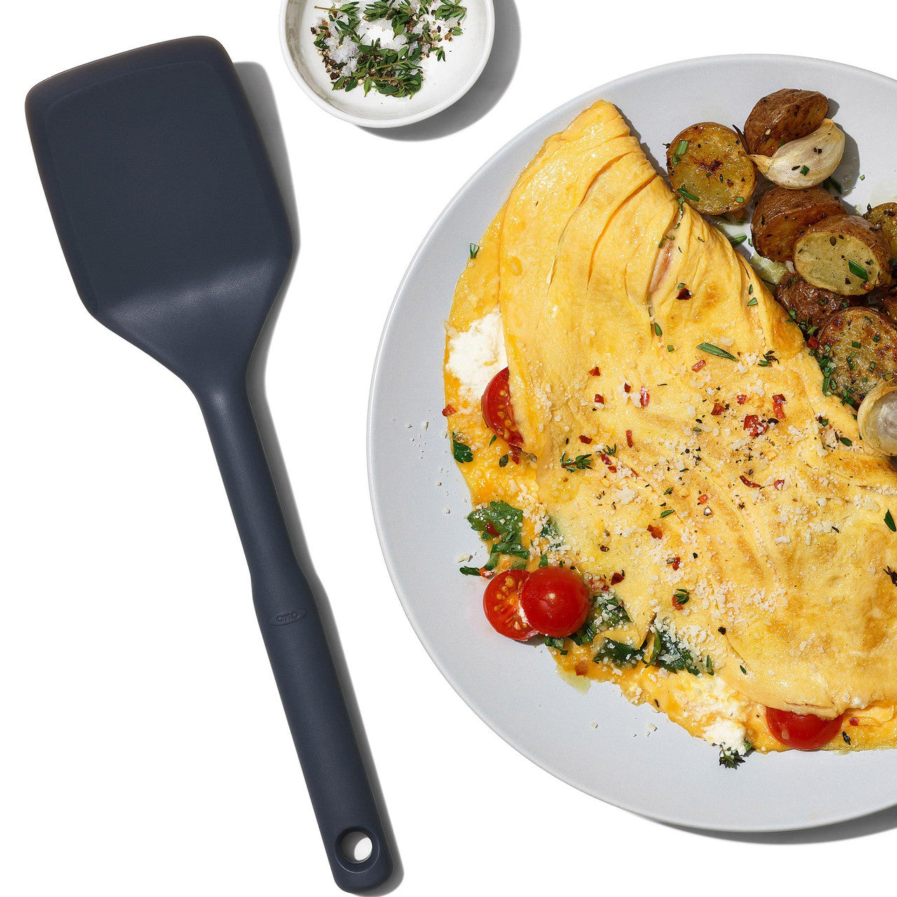 The OXO Good Grips Silicone Everyday Flexible Turner is the perfect tool for flipping burgers, chopping ground beef and lifting cookies without crumbling. The flexible metal core is encased in heat-resistant silicone for use in hot pans and sheet pans straight out of the oven. The turner's head has beveled edges that slip under food for lifting and hug the sides of pans for fast deglazing. It's also large enough to transport chicken or fish filets and sturdy enough to break up ground meat — all without scratching non-stick cookware. The turner’s neck is angled to better clear the sides of large pans, reducing wrist strain while you work, and the soft, non-slip handle provides comfort during any cooking task. This sturdy turner is dishwasher safe for easy cleanup.