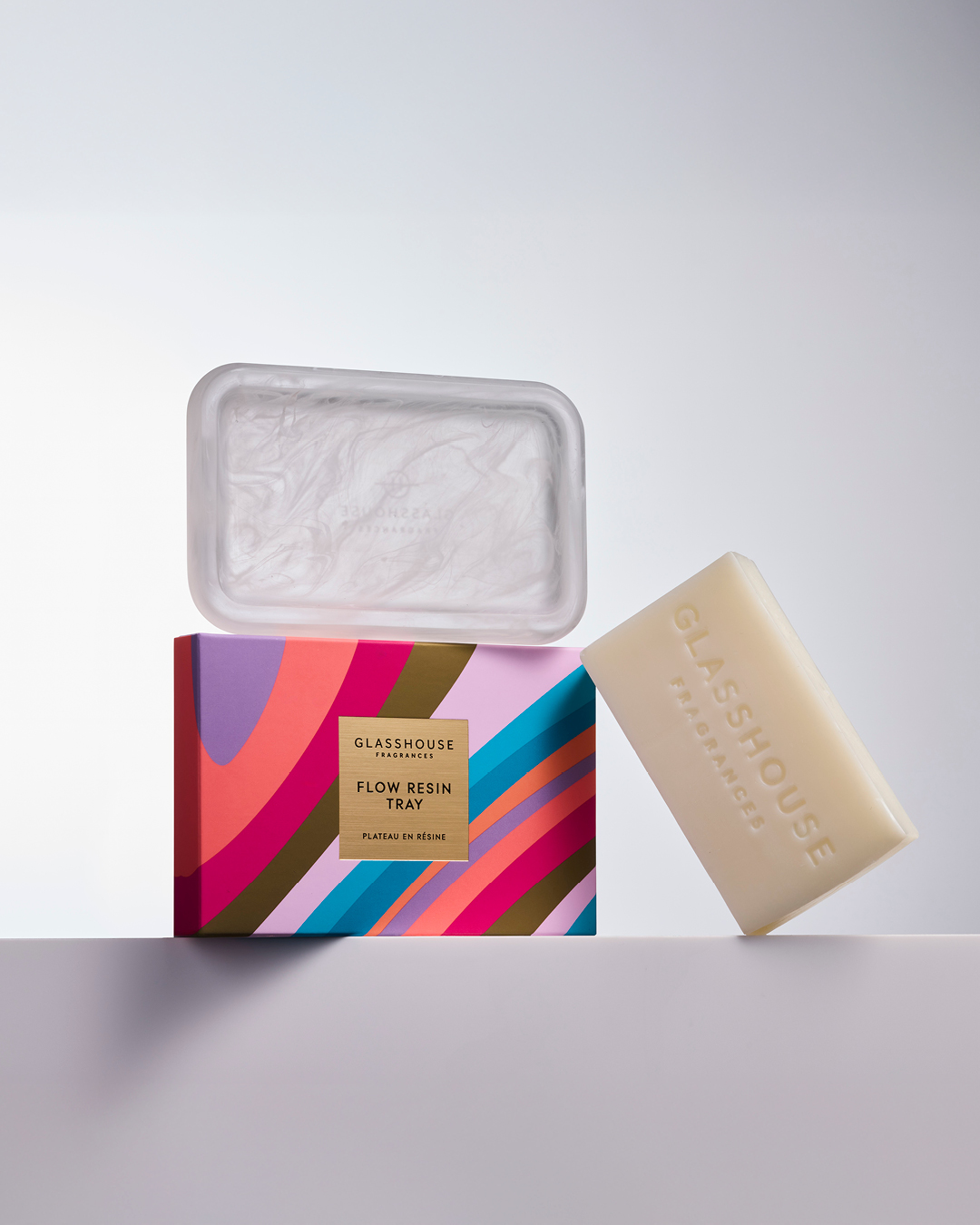 Crafted from semi-translucent white resin with a harmonious marble effect, this rectangular tray is perfectly sized for our 180g body bars.