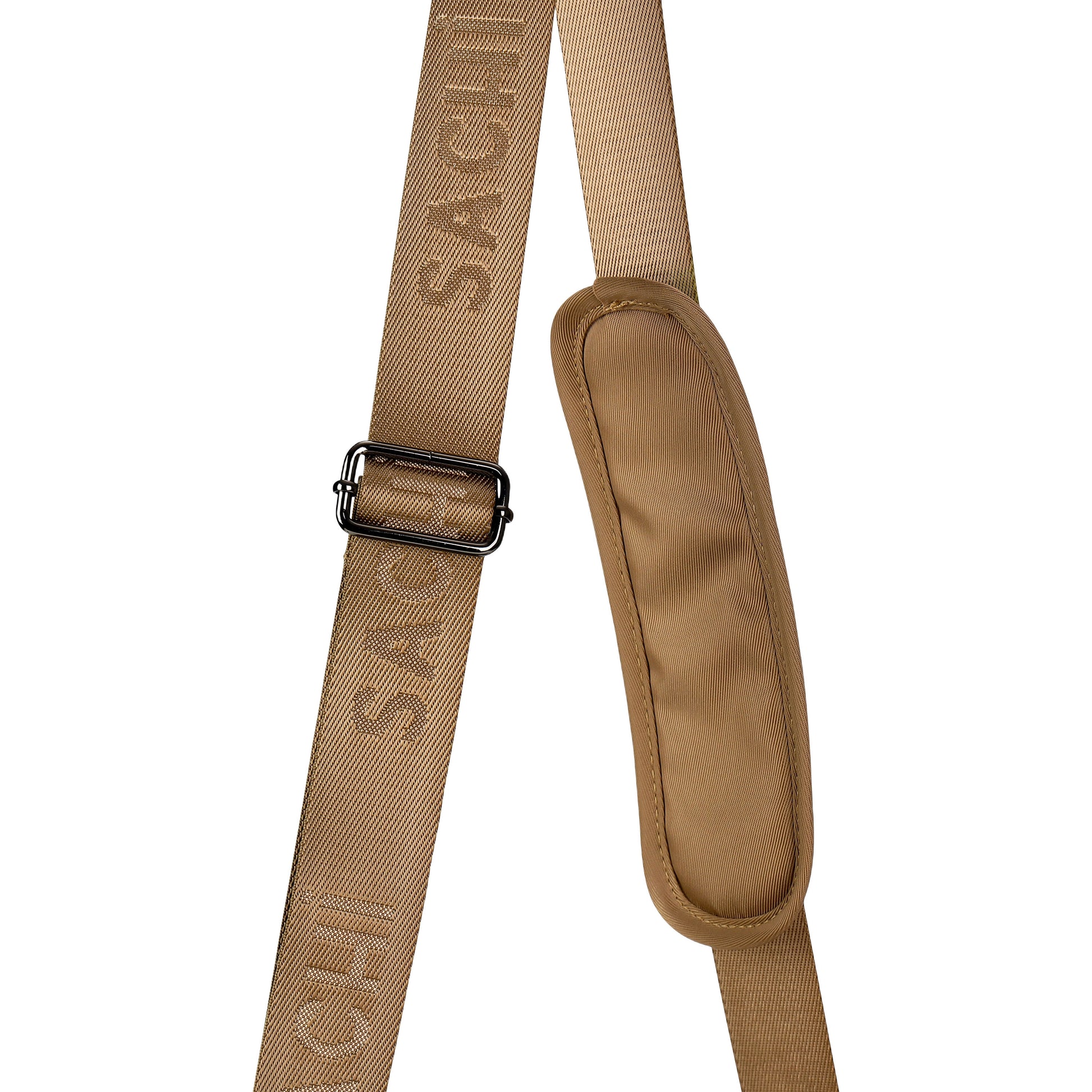 - Detachable, adjustable padded shoulder strap with jacquard Sachi branding.