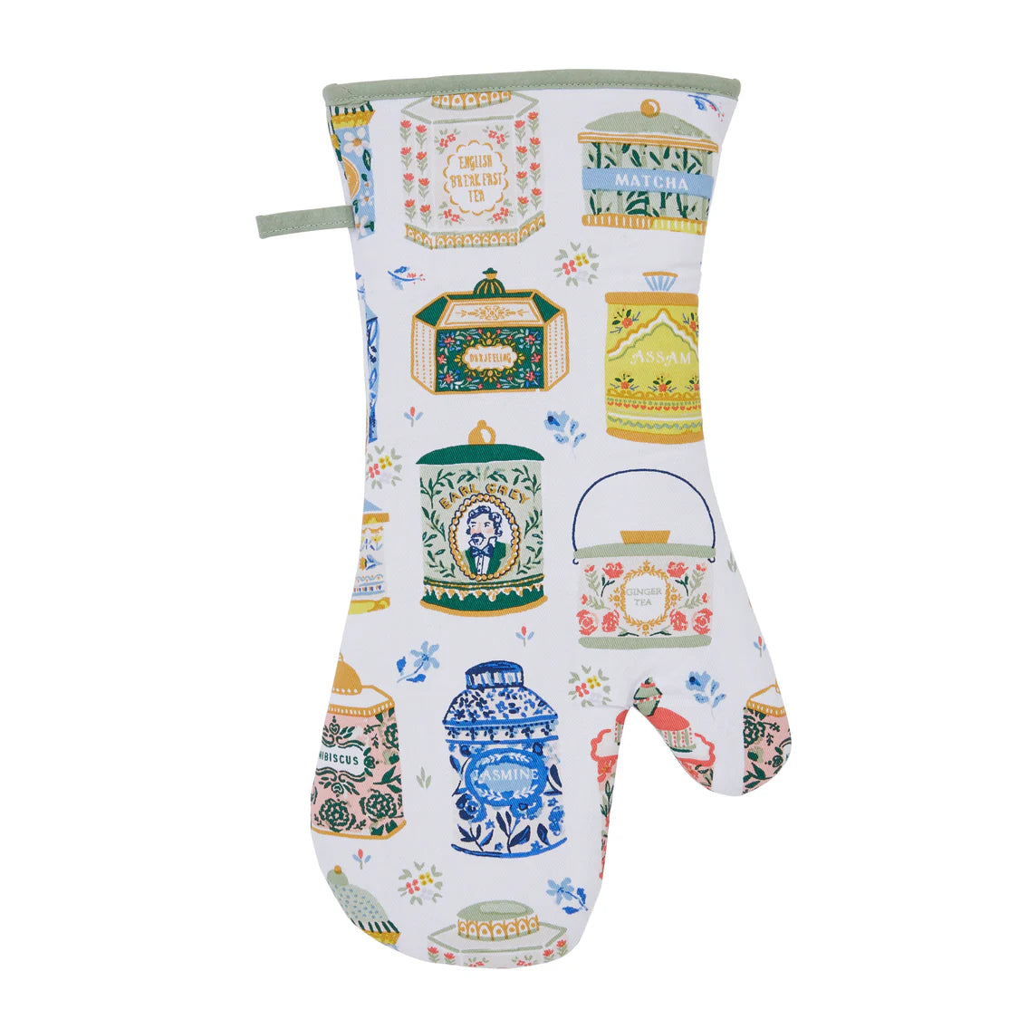 This Tea Tins Oven Gauntlet adds elements of romance and beauty when entertaining friends and family for large dinners! It features an eclectic display of vintage tea tins in delicate heirloom designs and sugary shades corresponding to each tea’s origin and taste.