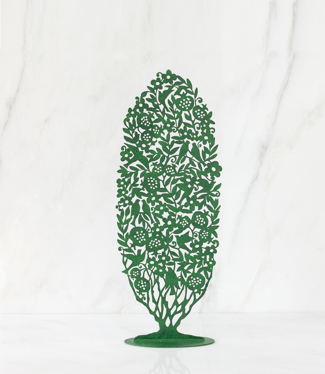 “This piece reflects my love and reverence of trees — their graceful, columnar, beckoning, magical qualities. They have so much character and gesture. When I look up at the canopy of trees in the sunlight, the leaves look dark and lacy — a silhouette of beautiful shapes where the light comes through. I like to look at the delicate patterns created. I wanted to create a two-dimensional tree silhouette, but one that was animated and alive with images of birds, leaves, pomegranates — symbols of life and light. This pierced-metal tree can be used as an architectural element in the Nativity or with The Christmas Story. I hope it adds an interesting detailed pattern to the scene." —Susan Lordi