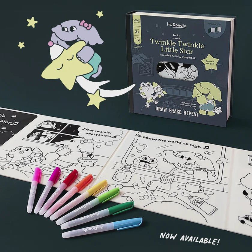 Twinkle Twinkle Little Star is HeyDoodle’s magical spin on the classic nursery rhyme, brought to life on a reusable silicone mat. Children can trace the lyrics, colour the stars and moons, and journey alongside adorable nighttime animal friends.