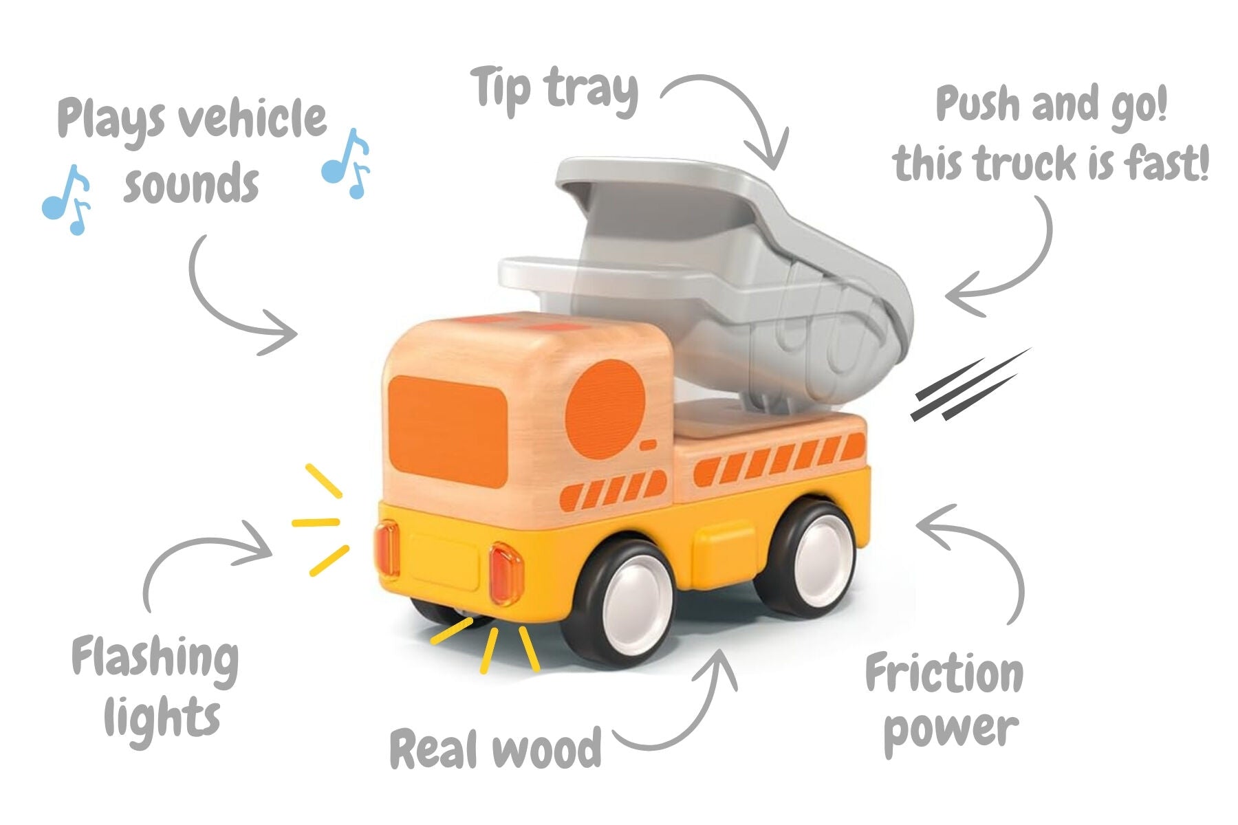 Unleash a world of construction fun with the Wooden Friction Work Dump Truck from Wanborns. This rugged little dump truck, crafted from a blend of natural wood with vibrant orange detailing and of high quality ABS plastic components, is ready to roll into action. Powered by friction, it zooms across the floor with a mighty vroom that makes playtime come alive. But that s not all, press down on the dump truck, and you will hear three exciting sounds: the roar of the engine starting up, a cheerful horn beep, and the beep beep of the truck reversing. Plus, the headlights light up for extra fun.