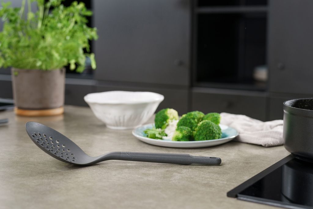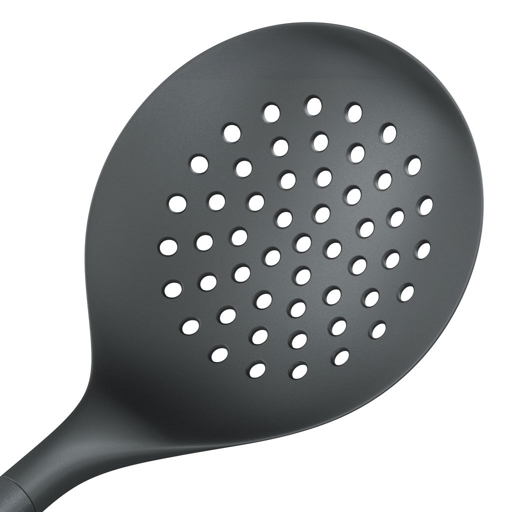 The Zyliss Skimmer is the perfect kitchen utensil. The "Eco" handle is made of 50% wheat straw. This renewable raw material reduces the need for virgin plastics. The head is made of heat resistant nylon whilst the handle features a matt finish to provide a steady grip. It si the perfect utensil when needing to skim foods etc when frying, making soups etc, making it an essential kitchen item